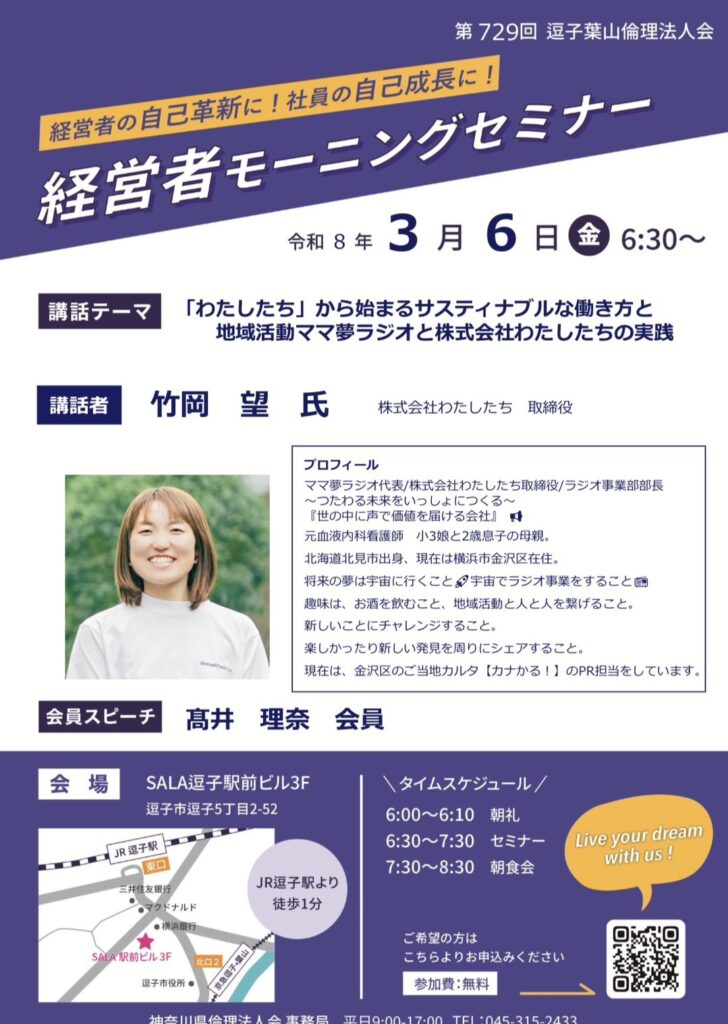 2026年3月6日(木)、逗子葉山倫理法人会が主催する「経営者モーニングセミナー」にて、弊社取締役の竹岡望が講話を行いました。